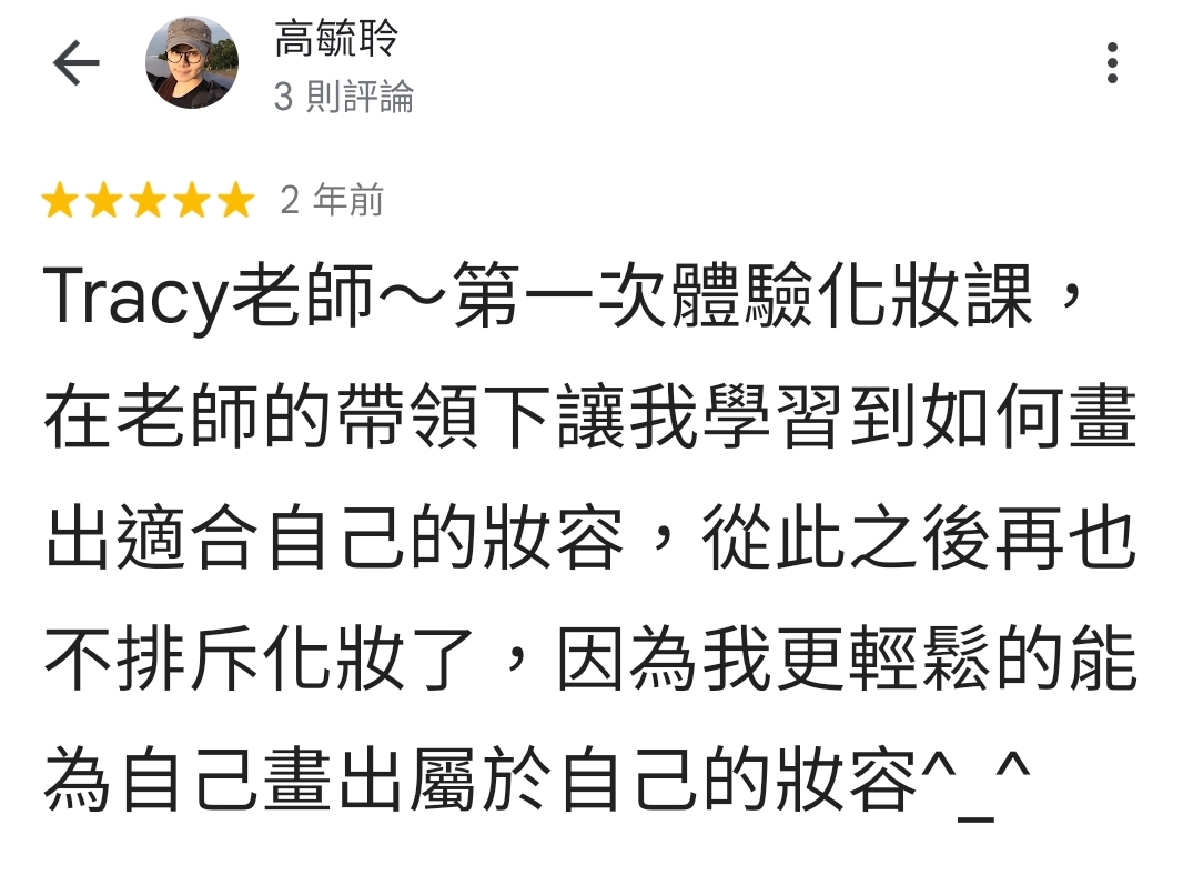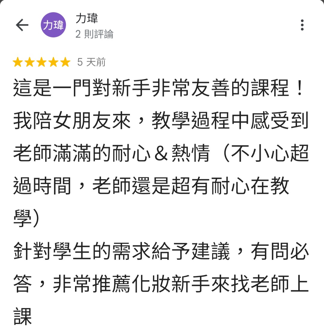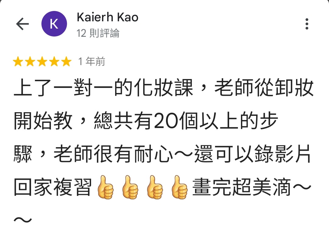 蕎纓老師超有耐心,會一步步教,還會回答所有問題。第一次上妝就覺得自己可以掌握技巧,好放心。