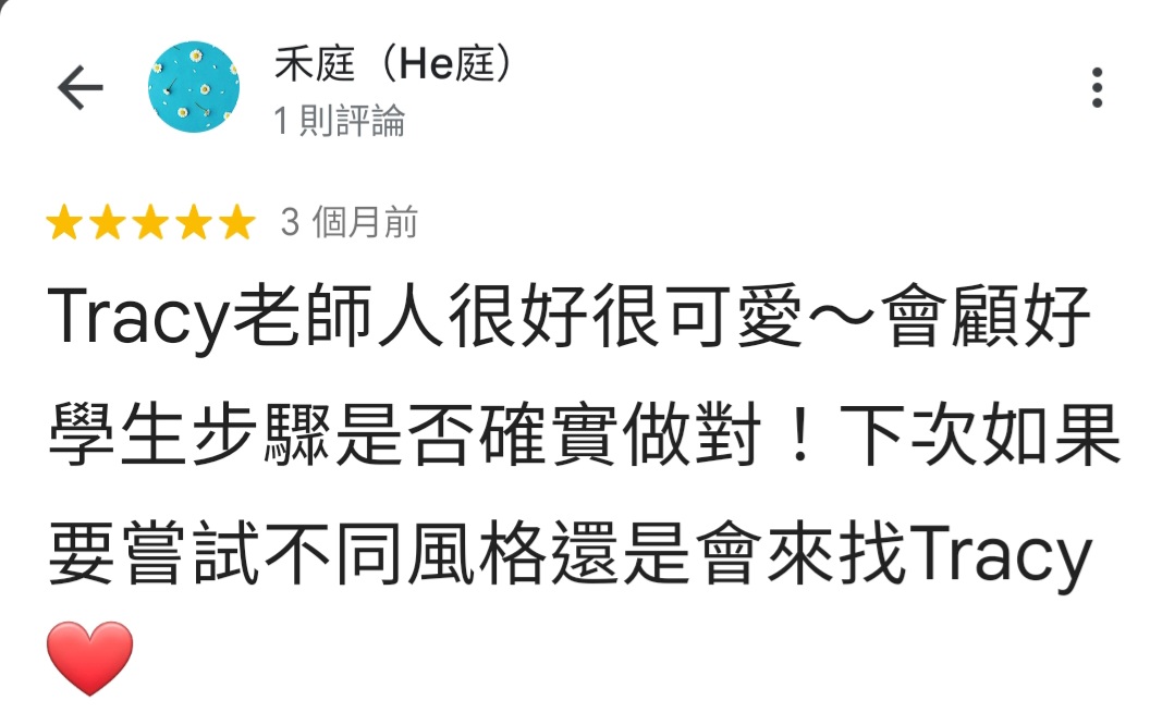 蕎纓老師會確認每個步驟有沒有做對,細心教導。下次想換風格,也還想找蕎纓老師。